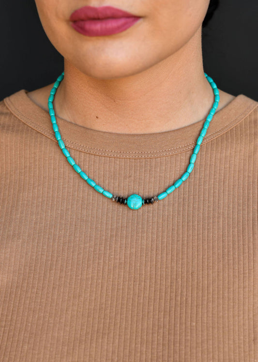 16" Silver Disc Beaded Necklace with Green Turquoise