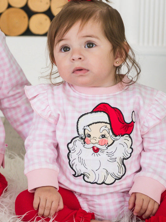 Baby Girls Dear Santa Pink Gingham Applique Sweatshirt Bubble Romper