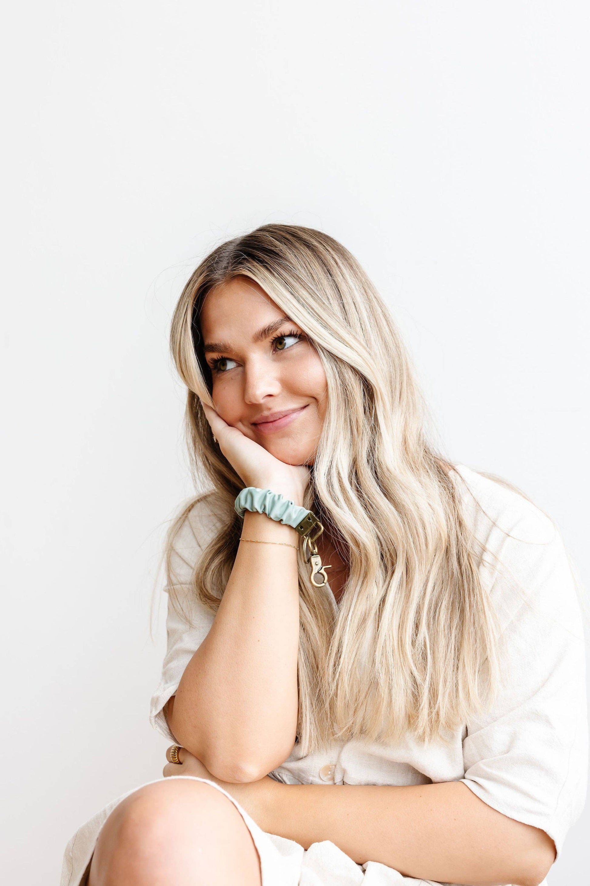 OMGGGG the best keychain you've ever had is here!! Our new ANDi exclusive keychains are the best thing since sliced bread and you need all of them! This is our luxe fabric in our old frosted jade color, it was a best seller so I know the keychain will flyyyy. The color is a perfect light sage color and the material is durable and silky smooth. It's the perfect fabric for everyday wear and we are obsessed.