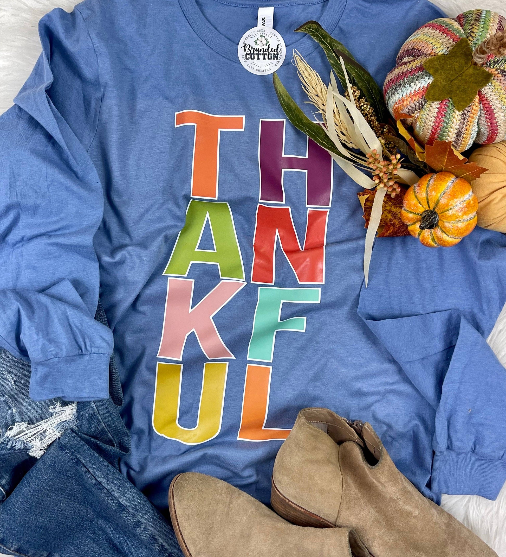 Introducing our Thankful Stacked Tee showcasing our signature blend of style and comfort. This Bella Lavender Blue Long Sleeve is more than just a t-shirt; it's a testament to our love for casually cute and always comfortable tees. E