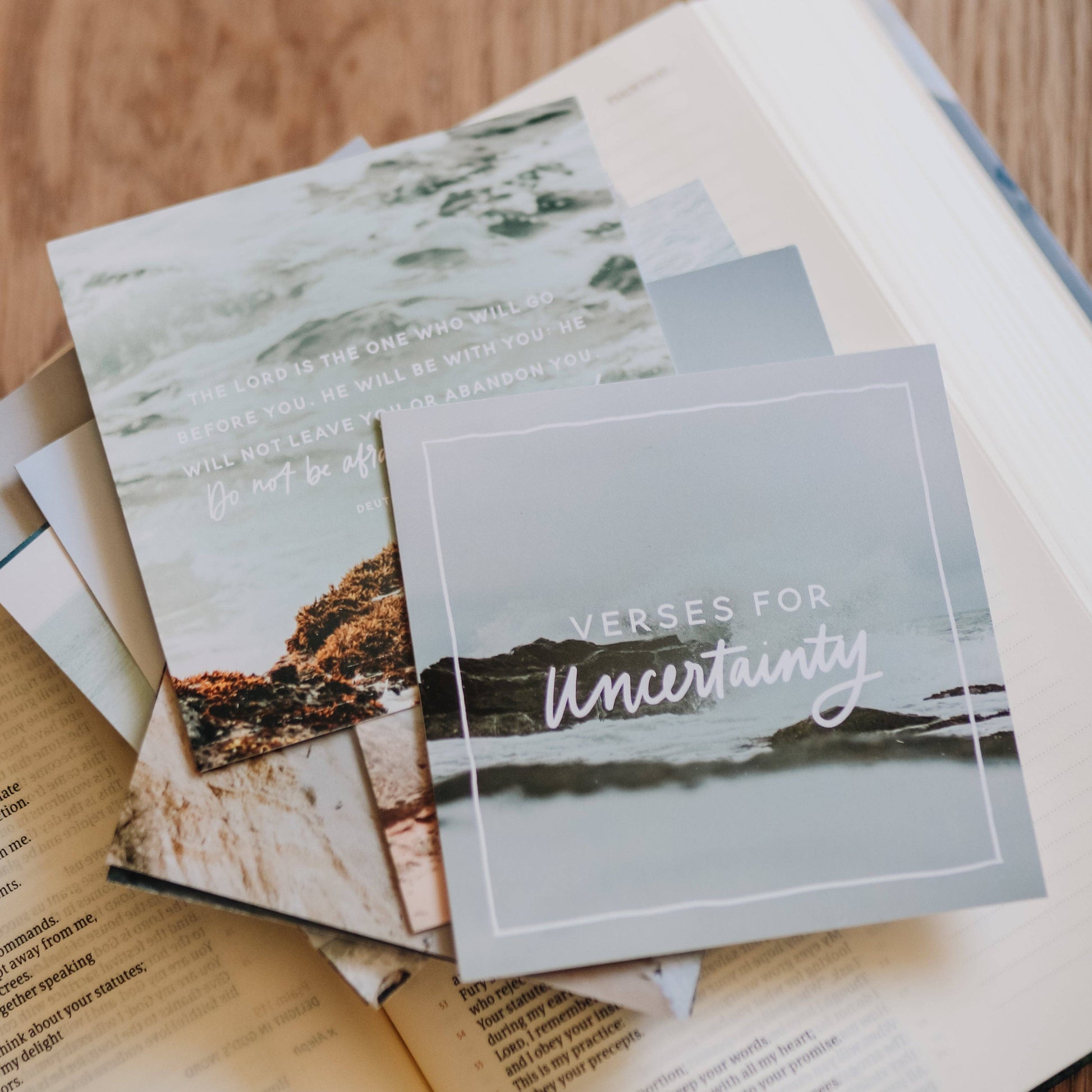Verse Cards for Uncertainty features 20 cards with beautiful Bible verses and prayer prompts specifically for addressing uncertainty.